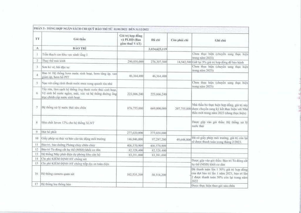 Nhằm phục vụ cho hội nghị nhà chung cư thường niên, BQT xin gửi đến Quý cư dân báo cáo tài chính quỹ bảo trì năm 2022, cụ thể: