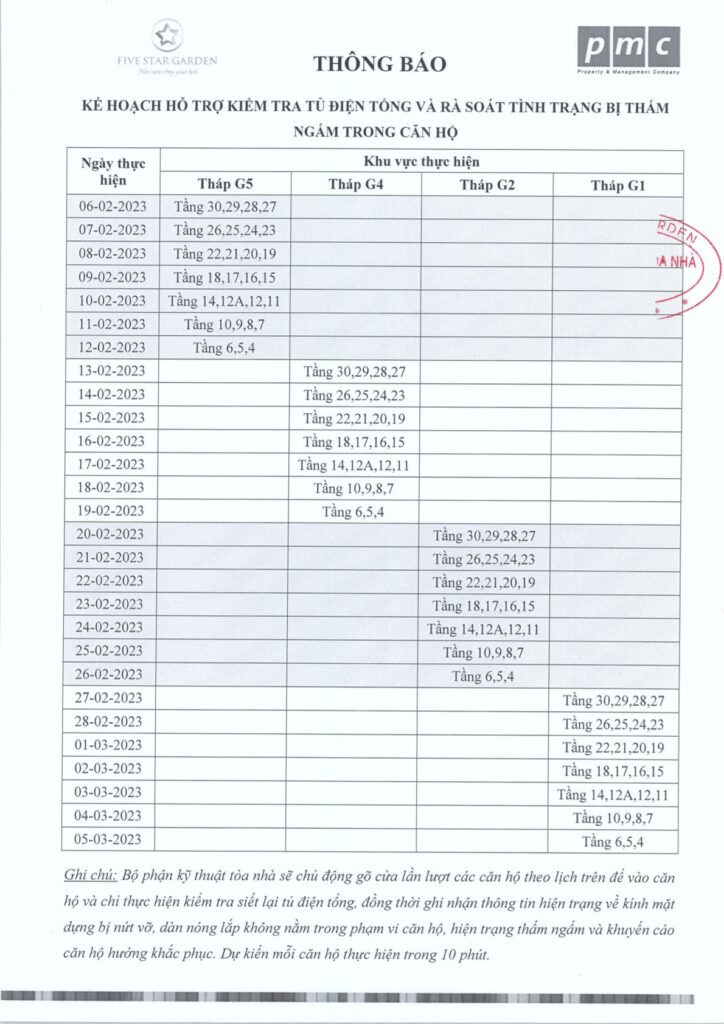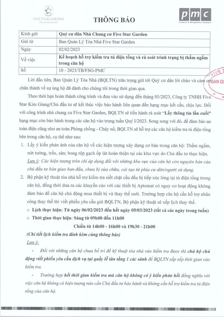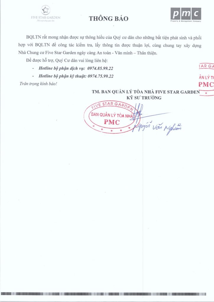 BQLTN rất mong nhận được sự thông hiểu của Quý cư dân cho những bất tiện phát sinh và phối hợp với BQLTN để công tác kiểm tra, lấy thông tin được thuận lợi, cùng chung tay xây dựng Nhà Chung cư Five Star Garden ngày càng An toàn – Văn minh – Thân thiện.