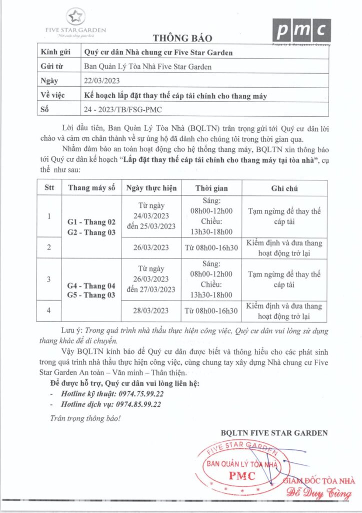 Vậy BQLTN kính báo để Quý cư dân được biết và thông hiểu cho các phát sinh trong quá trình nhà thầu thực hiện công việc, cùng chung tay xây dựng Nhà chung cư Five Star Garden An toàn – Văn minh – Thân thiện.