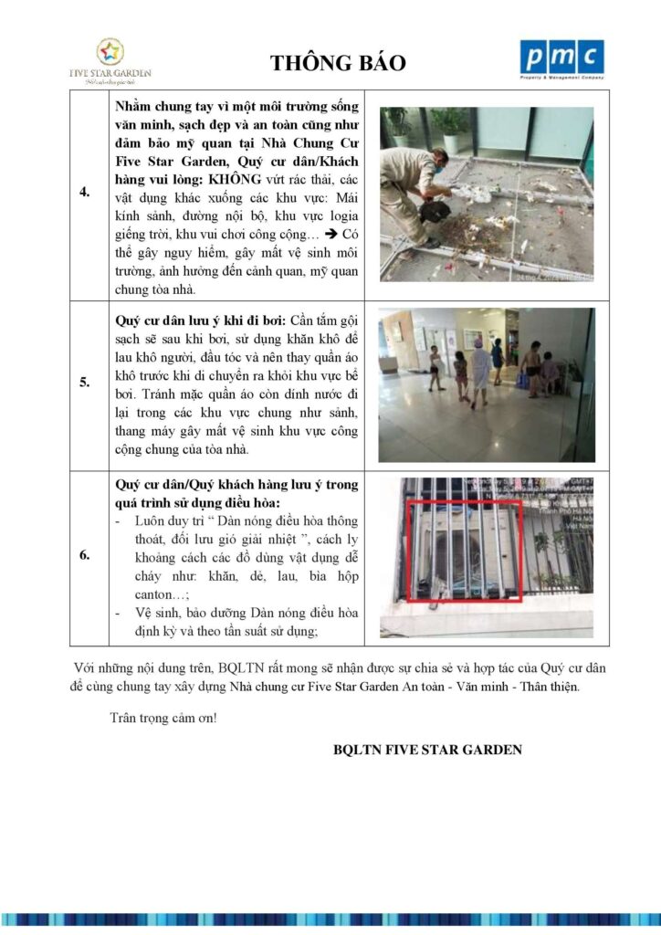 - Nhằm chung tay vì một môi trường sống văn minh, sạch đẹp và an toàn cũng như đảm bảo mỹ quan tại Nhà Chung Cư Five Star Garden, Quý cư dân/Khách hàng vui lòng: KHÔNG vứt rác thải, các vật dụng khác xuống các khu vực: Mái kính sảnh, đường nội bộ, khu vực logia giếng trời, khu vui chơi công cộng… è Có thể gây nguy hiểm, gây mất vệ sinh môi trường, ảnh hưởng đến cảnh quan, mỹ quan chung tòa nhà.