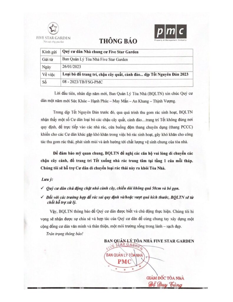 Trong dịp Tết Nguyên Đán trước đó, qua quá trình thu gom rác sinh hoạt, BQLTN nhận thấy một số Cư dân loại bỏ các chậu cây quất, cành đào…trang trí Tết không đúng nơi quy định, để trực tiếp vào các nhà rác, cửa buồng đệm thang chuyên dụng (thang PCCC) khiến cho các Cư dân khác gặp khó khăn trong việc bỏ rác sinh hoạt, gây khó khăn cho công tác thu gom rác thải, phát sinh mùi và ảnh hưởng tới chất lượng vệ sinh chung của tòa nhà.