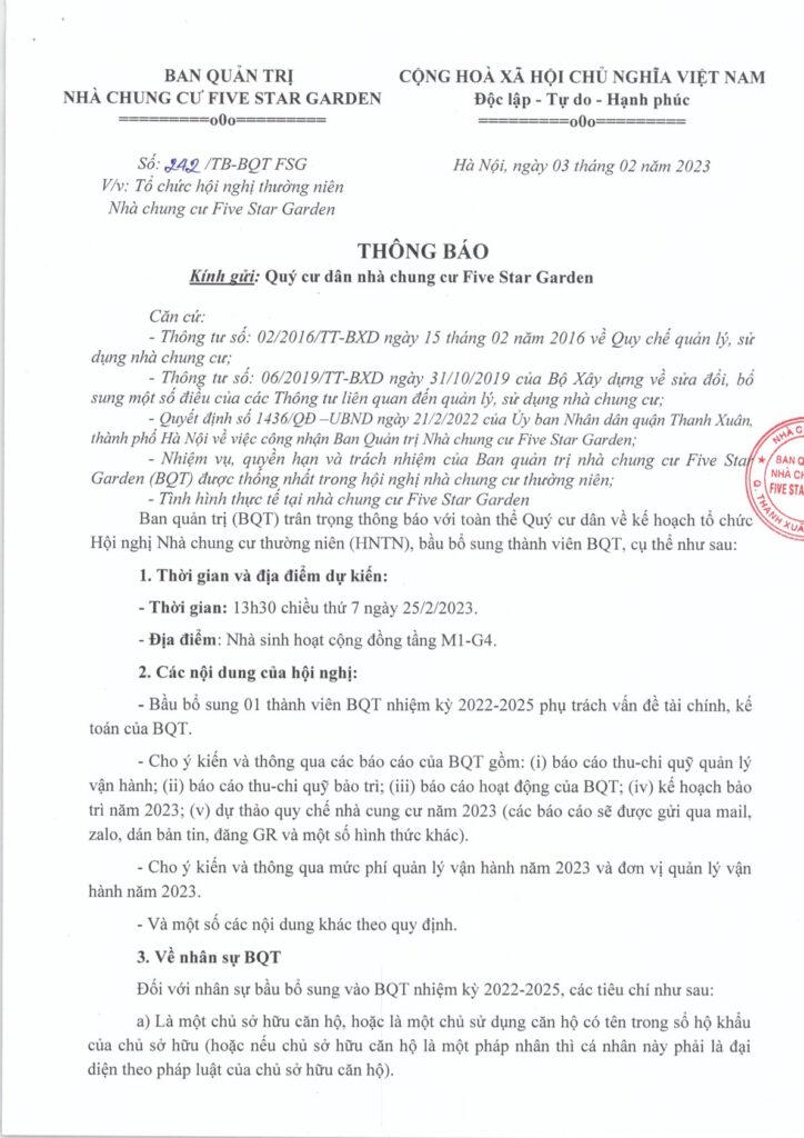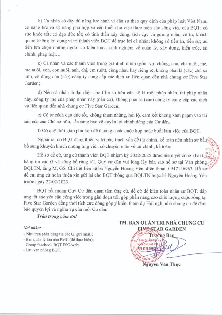 BQT rất mong Quý Cư dân quan tâm ứng cử, đề cử để kiện toàn nhân sự BQT, đáp ứng tốt các yêu cầu công việc trong giai đoạn tới, góp phần nâng cao chất lượng cuộc sống tại Five Star Garden đồng thời tích cực đóng góp ý kiến, tham dự Hội nghị nhà chung cư để đảm bảo quyền lợi và nghĩa vụ của mỗi Cư dân.