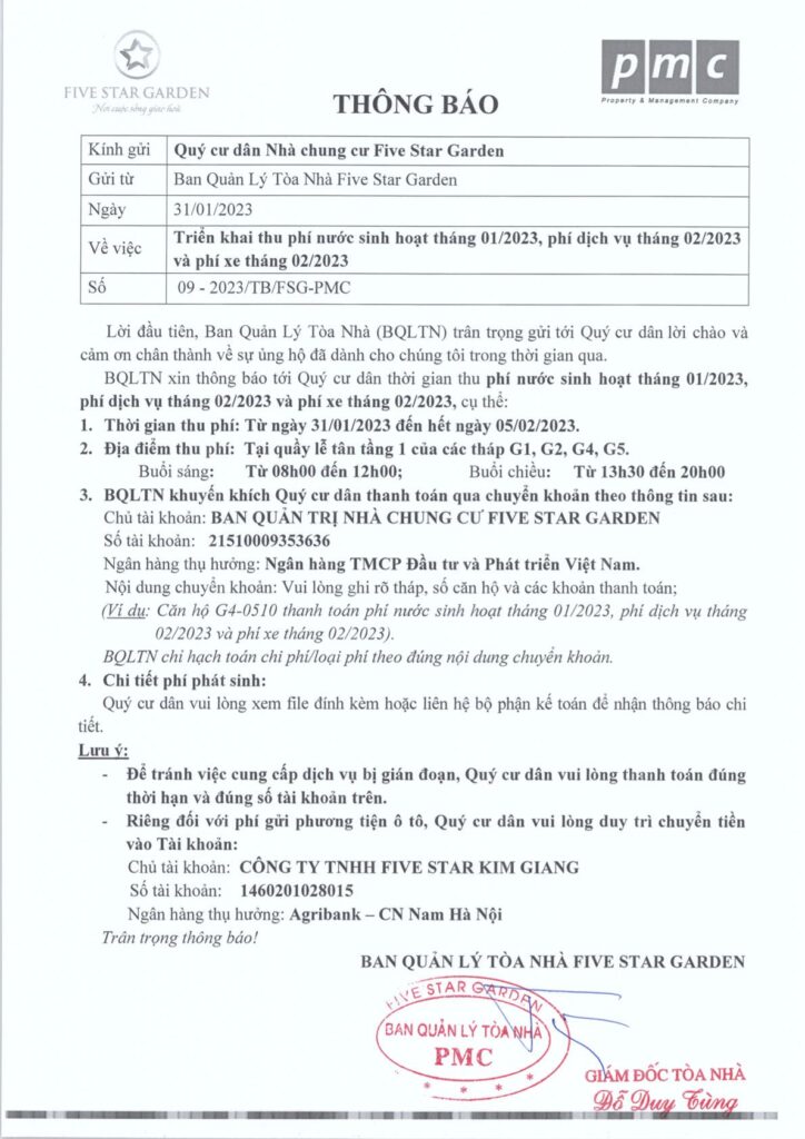 BQLTN xin thông báo tới Quý cư dân thời gian thu phí nước sinh hoạt tháng 01/2023, phí dịch vụ tháng 02/2023 và phí xe tháng 02/2023, cụ thể: